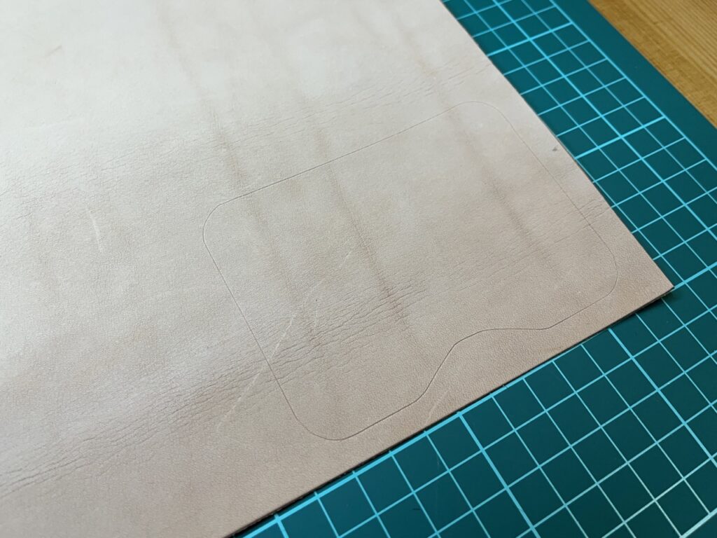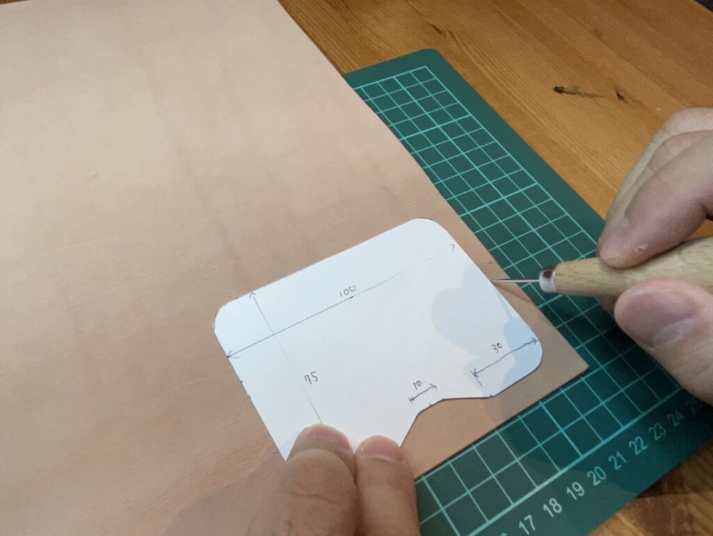 先ほど作った型紙を元に革に型を転写していきます。革に型紙をのせ、目打ちで周りをなぞっていきます。