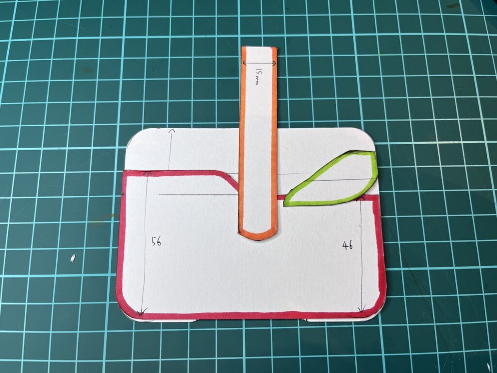 まずは作りたいもののイメージを明確にするため、いろいろとネットサーフィンも参考にしながら絵を書いてみました。その結果、今回は以下のようなリンゴ型のパスケースを作ることに決めました。