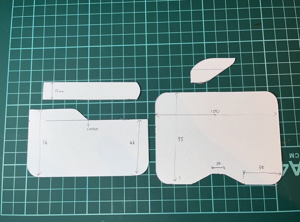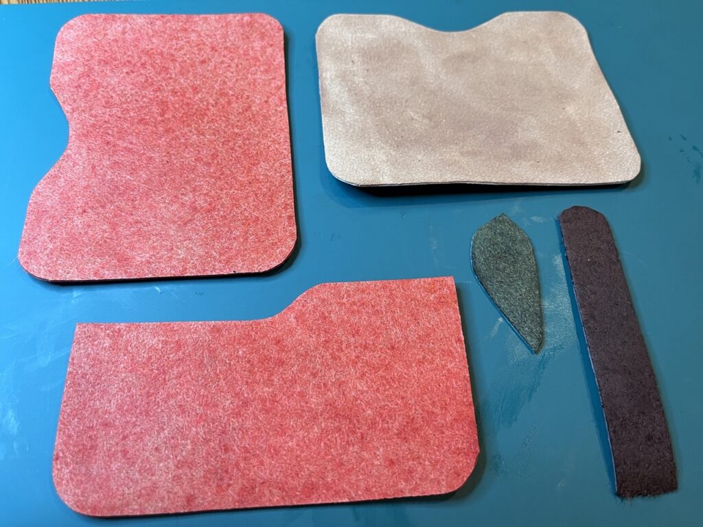 これをカッターでカットして、仮に組み立ててみます。型紙のパーツは全部で4つですが、一番大きいパスケースの土台となるパーツは裏表で違う色にしたいので、裏表分の2枚の革を切り出します。