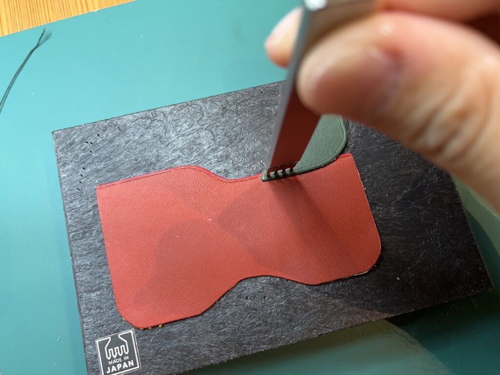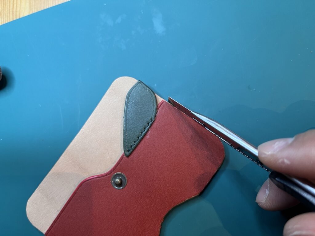 床面の処理が終わったら、組み立てた後にはできなくなる部分のコバを綺麗に処理していきます。具体的にはパスケースの一番表側に来る赤い革と緑の革です。まずヘリ落としという道具を使って革のエッジを滑らかに削り取ります。