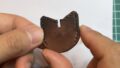 そしてこれらのパーツを最後に貼り合わせます。表面のパーツの端っこに慎重に接着剤をつけてくっつけます。ヘタの茶色いパーツも乗っけてみるとこんな感じになりました。