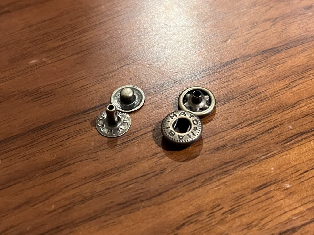 こういったホックは4つのパーツからできていて、凸パーツと凹パーツでホックを留めるのですが、それぞれに対して裏当てのような金具があります。