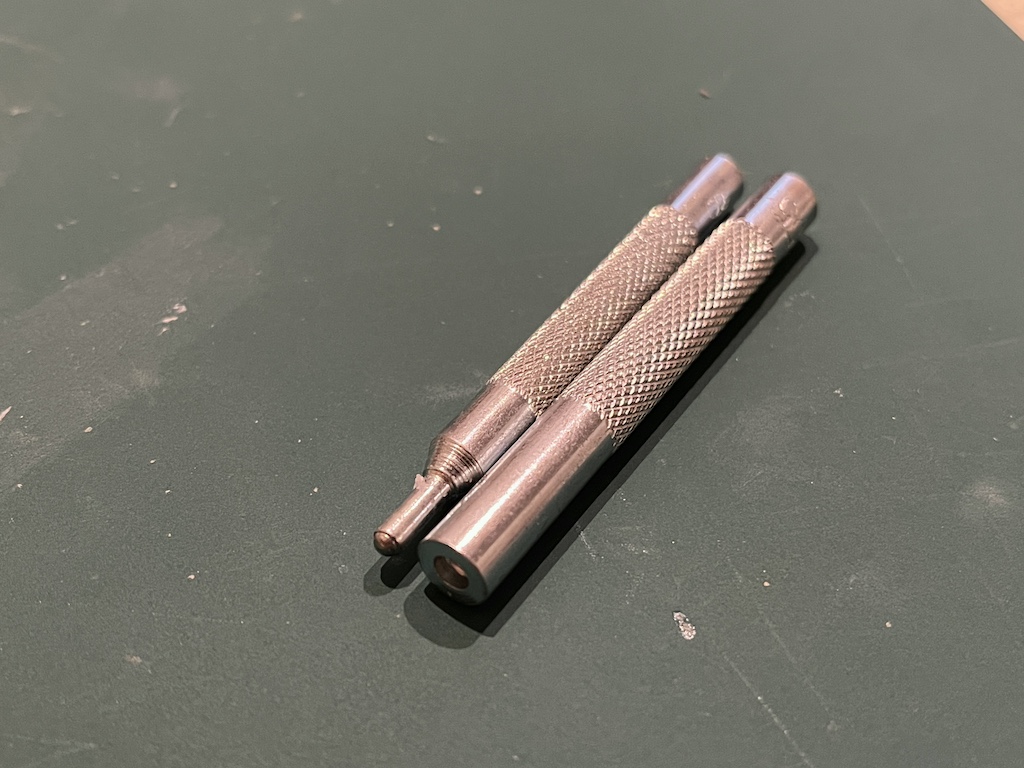 そして金具を取り付ける際は、専用の治具を使います。今回のホック取り付けに使用したのは以下のような治具で、凸パーツには凹型のポンチみたいなのを当てがい、上からハンマーで叩きます。逆に凹パーツは凸型のポンチみたいなのを当てがいハンマーで叩きます。