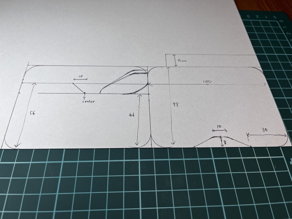 では早速作っていきましょう。今回はオリジナルの作品になるので、まずは設計図から作成していきました。スケッチした画像を元にして手書きで寸法を取っていきます。ちなみにR(角)の部分は一円玉を使って綺麗なカーブを書いていきました。