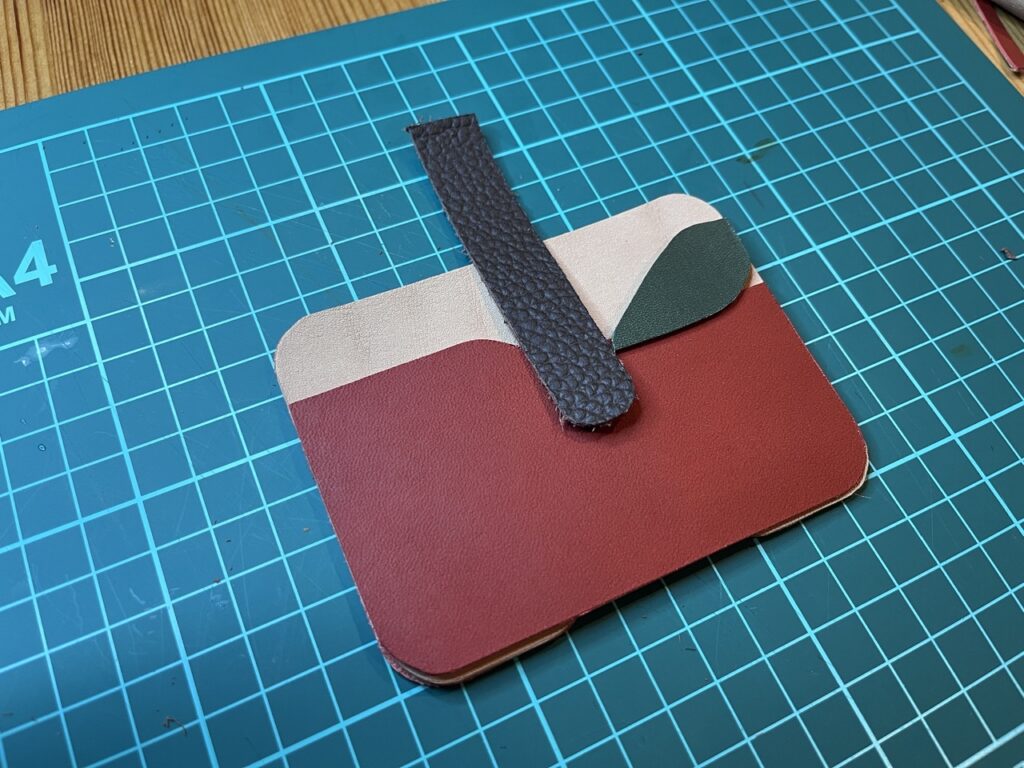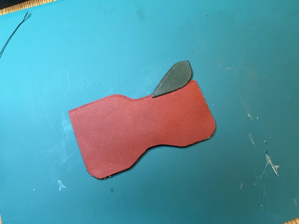 次にベースとなる背面の革を貼り合わせていきます。まずはベージュと赤の革を接着剤で貼り付けます。少しハミ出ていますがあとでトリミングするので気にしない。