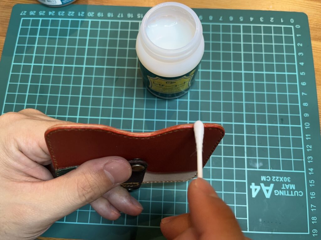 これを先ほど切り出したパーツの裏側に塗り込んでいきます。トコフィニッシュを指でごく少量とって裏側に塗ります。指で広げていってもいいですし、余ったいらない革や布を使って刷り込んでいく方法もあります。専用の道具としてはガラス板なんかもありますが、とにかく机に押し付けるようにして、裏側の毛羽だったところを平らにしていくように処理していきましょう。