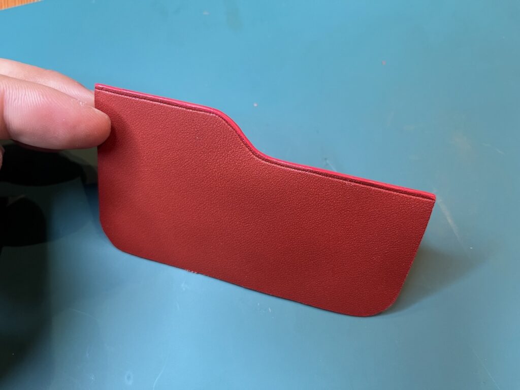 これをカッターで切り出します。今回使用した革は基本的に1mm厚ですが、ベージュの牛ヌメ革は表裏貼り合わせるところになるので厚さを抑えたいので0.6 mmを使用しています。